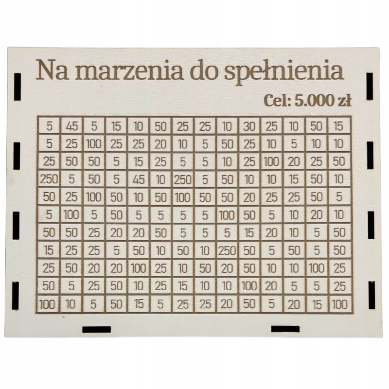 - Wygrawerowana tabelka: Na powierzchni skarbonki znajduje się tabelka, w której można wykreślać kolejne kwoty w miarę dodawania gotówki.