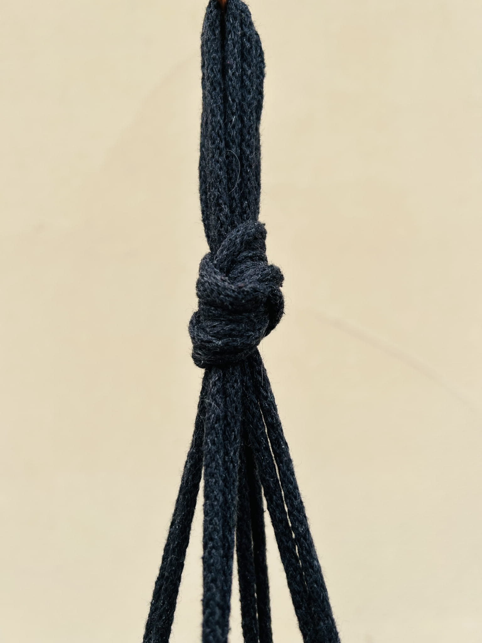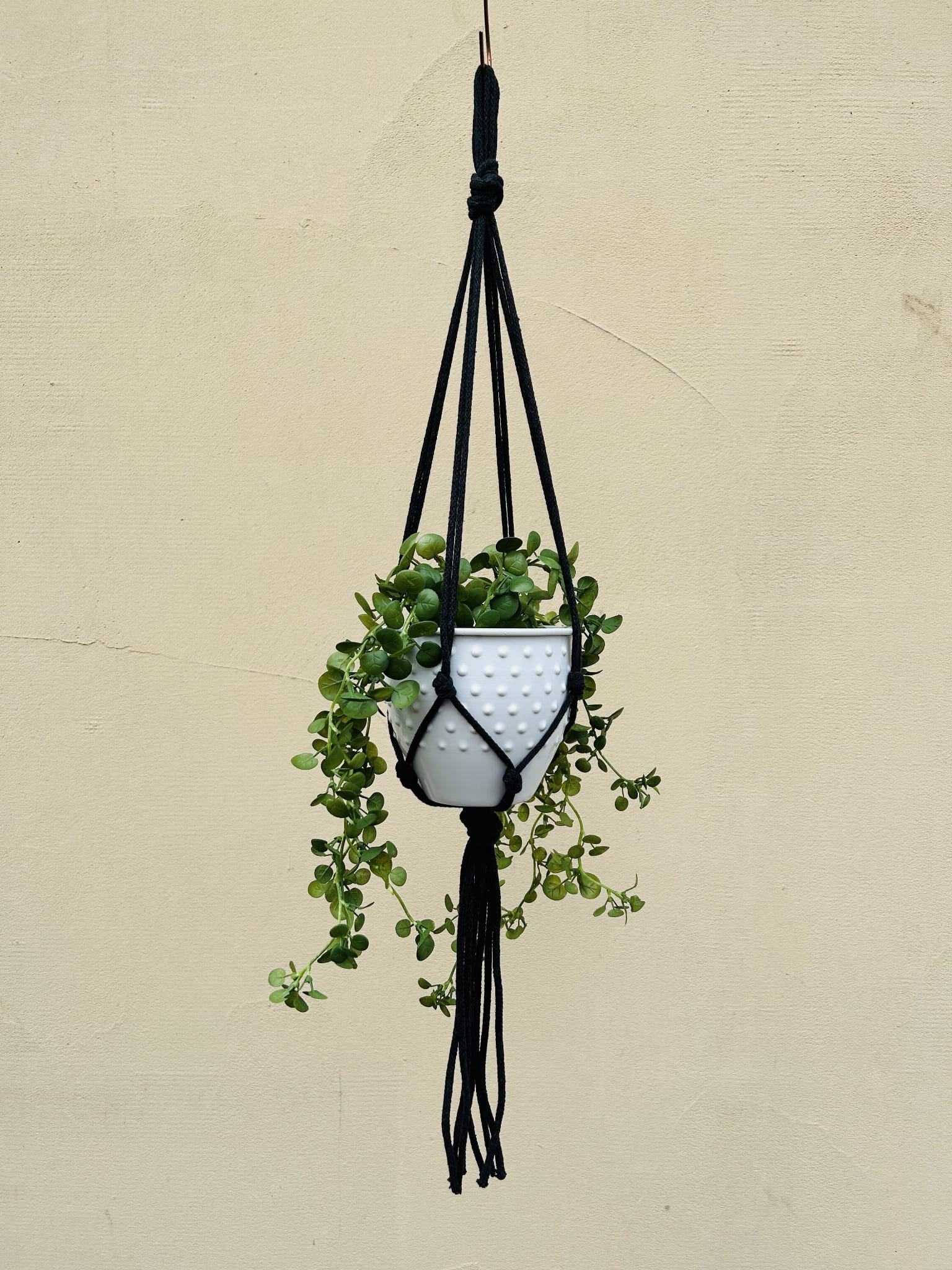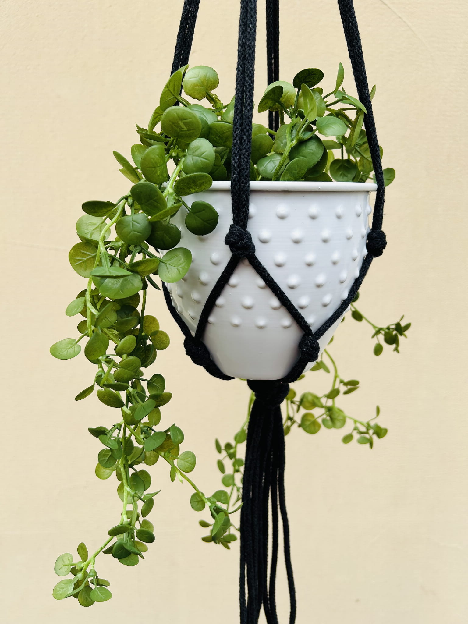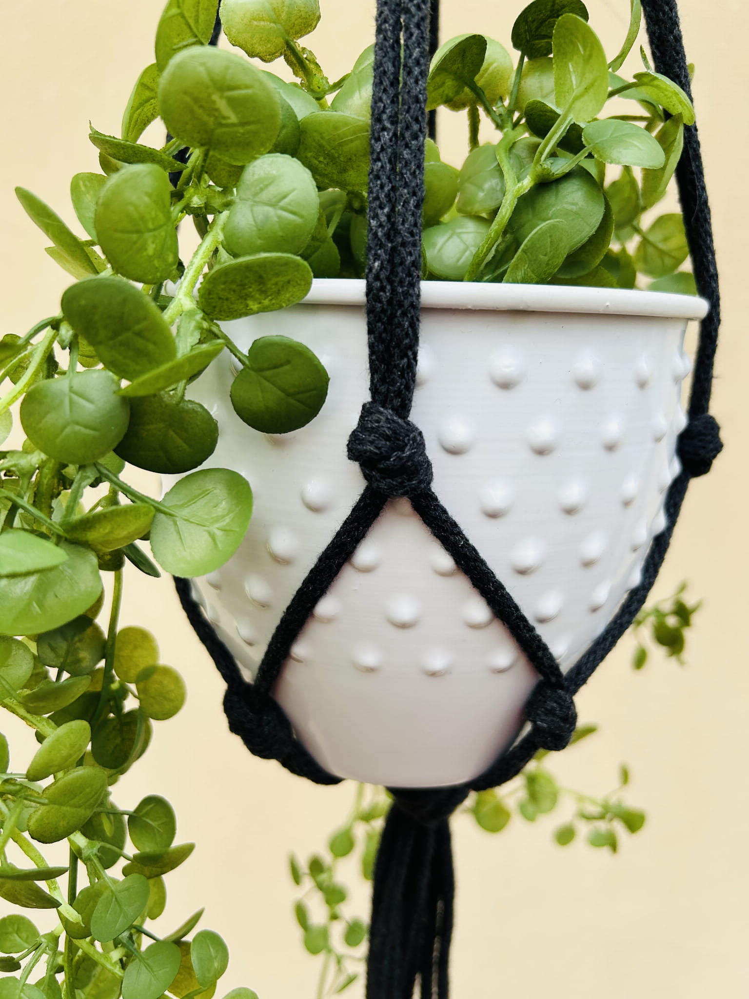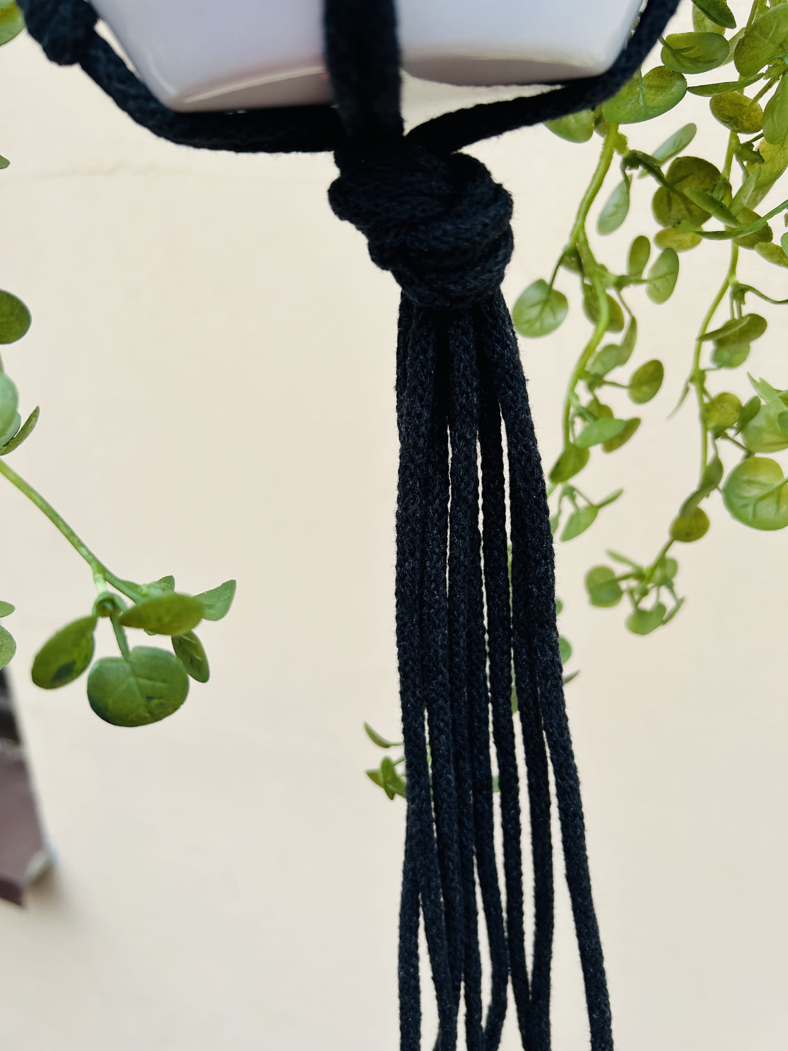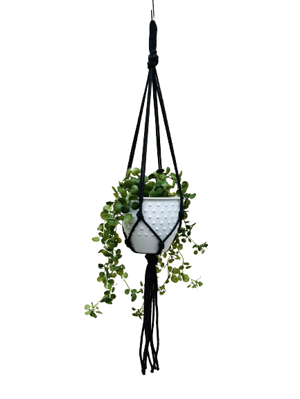 Kwietnik wiszący makrama. Wykonany ręcznie ze sznurka bawełnianego 5mm w kolorze antracytu.
