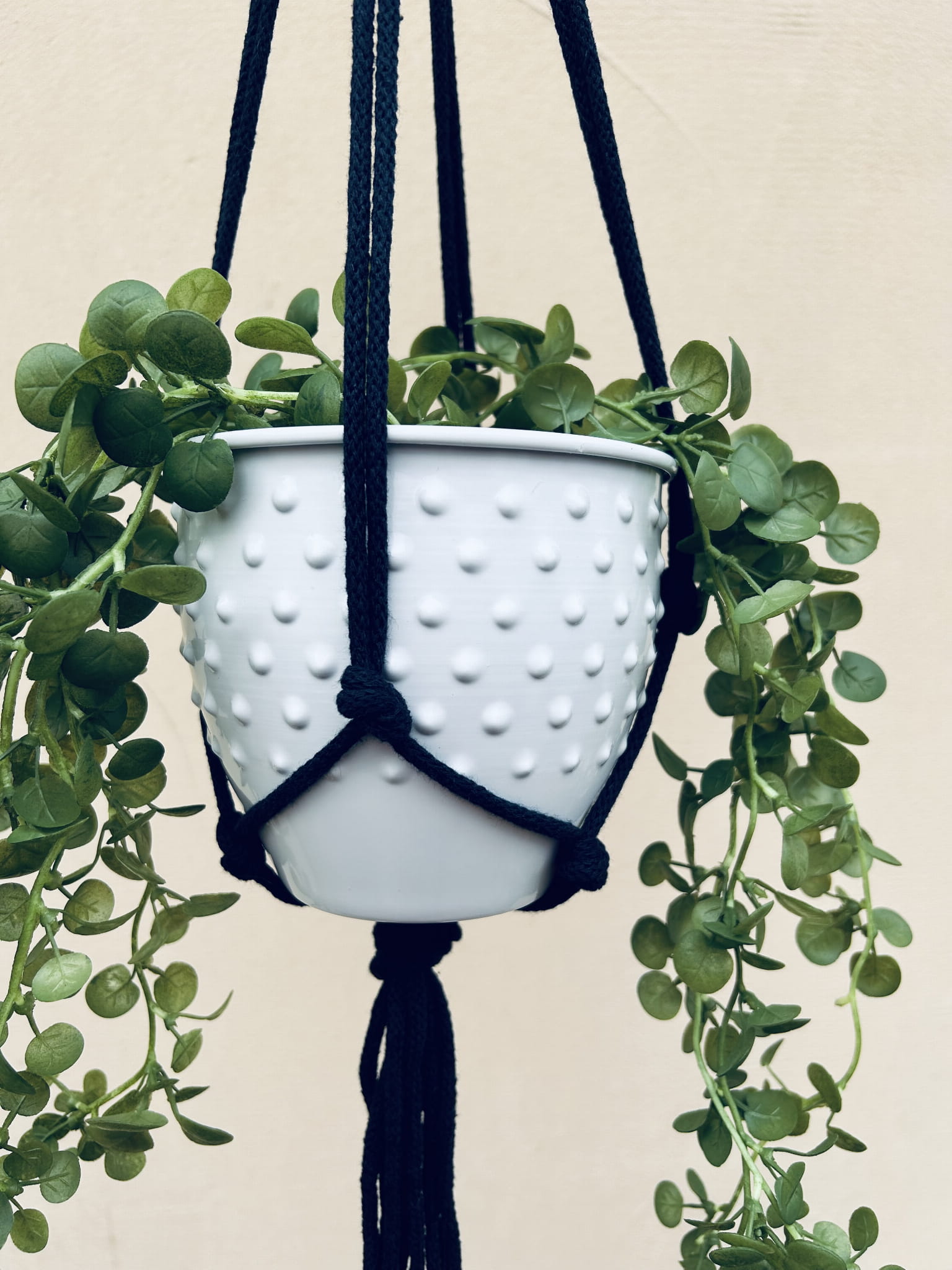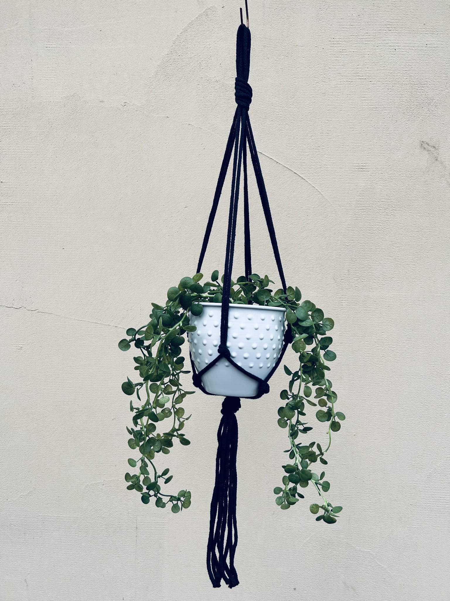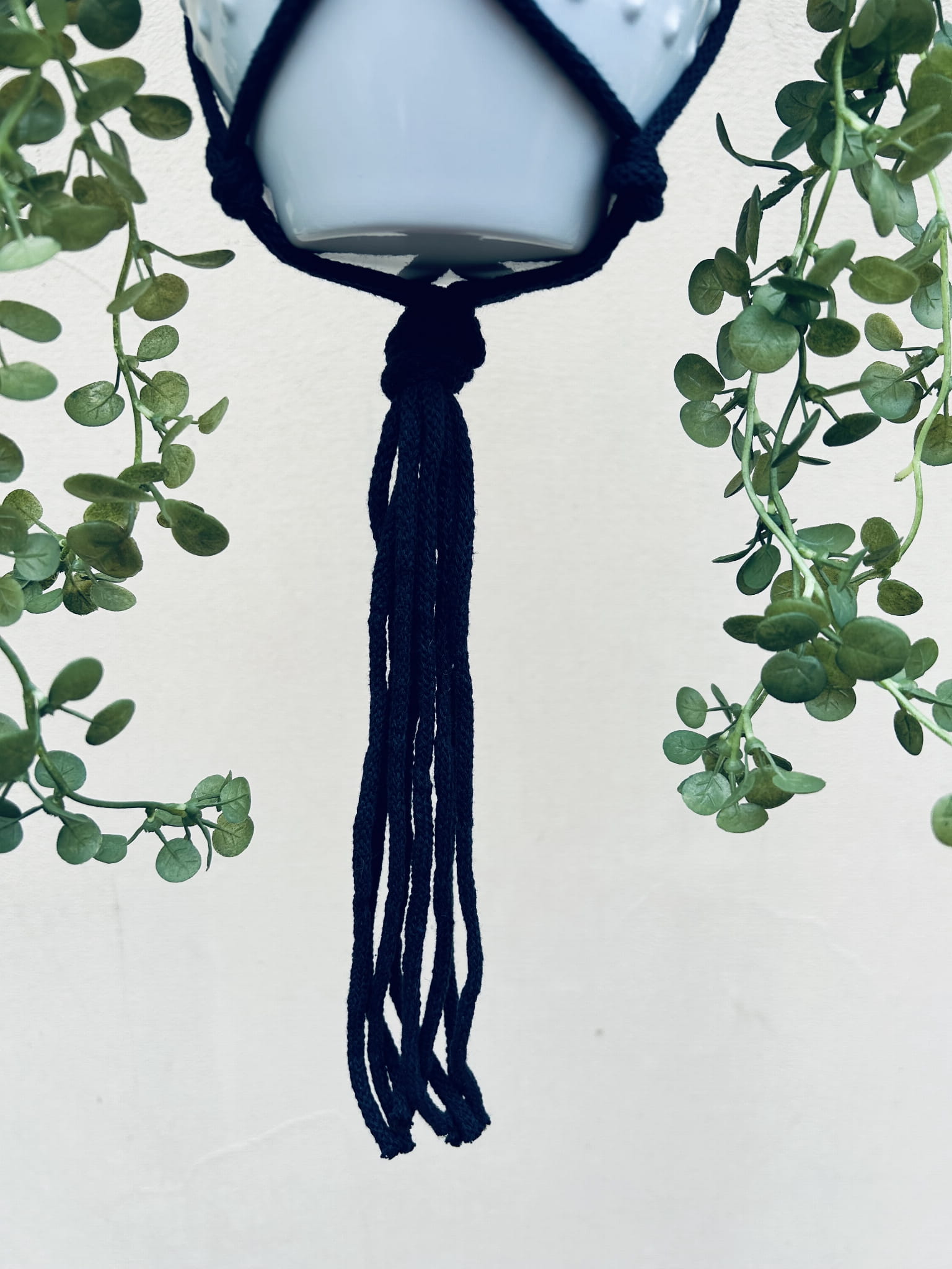 Kwietnik wiszący makrama. Wykonany ręcznie ze sznurka bawełnianego 5mm w kolorze atramentowym.