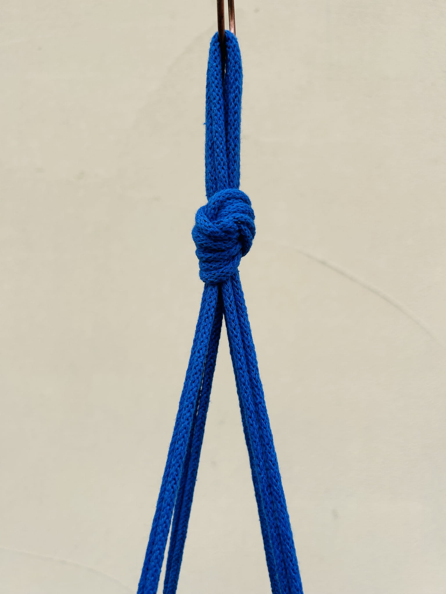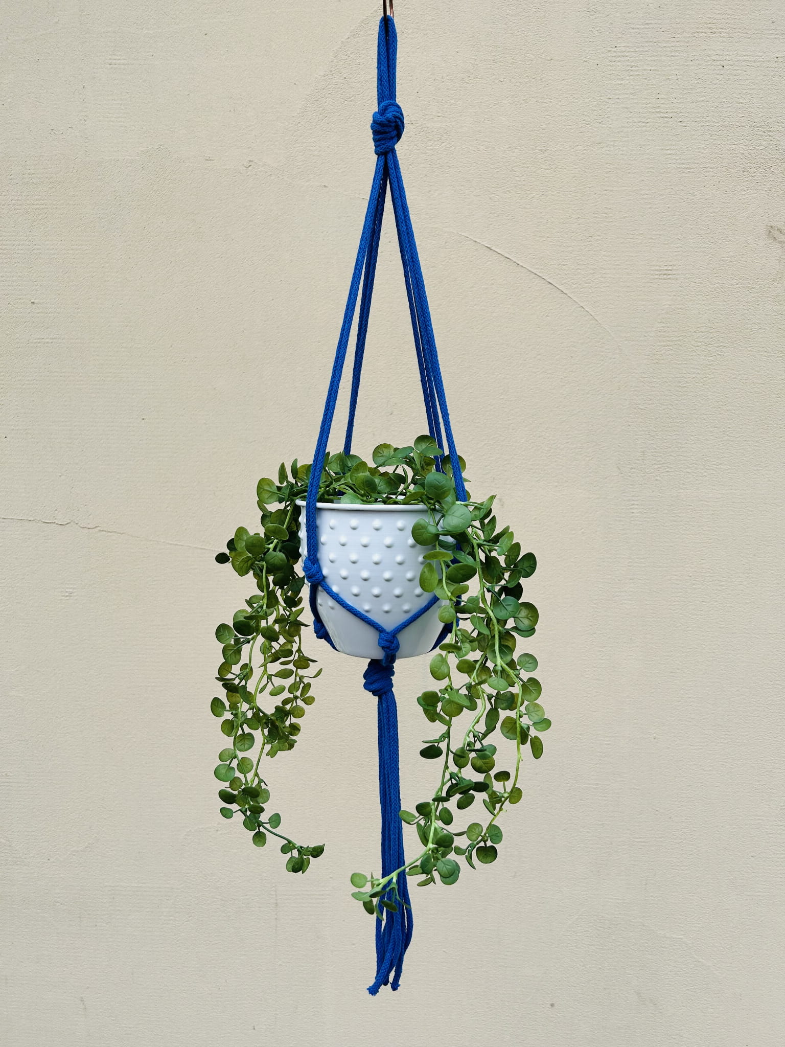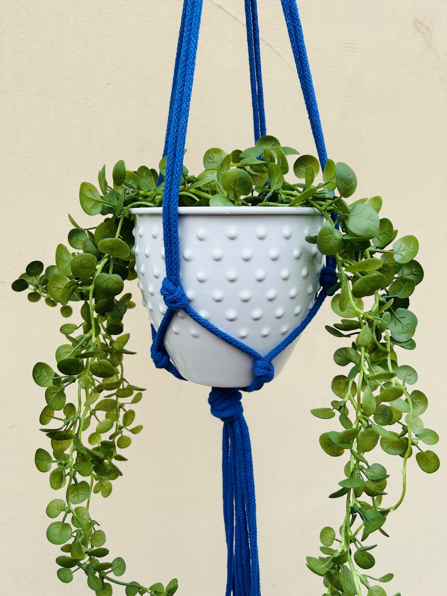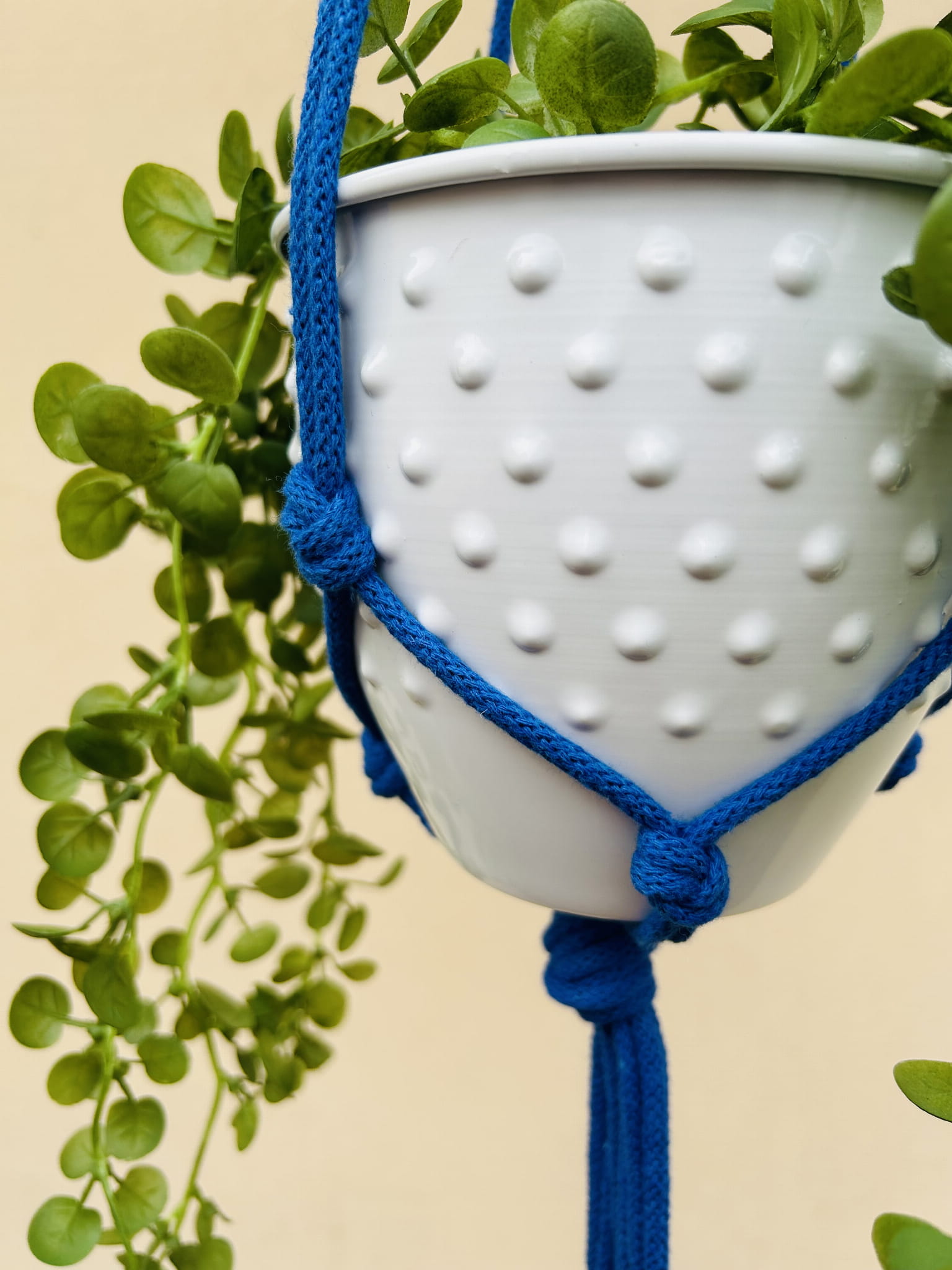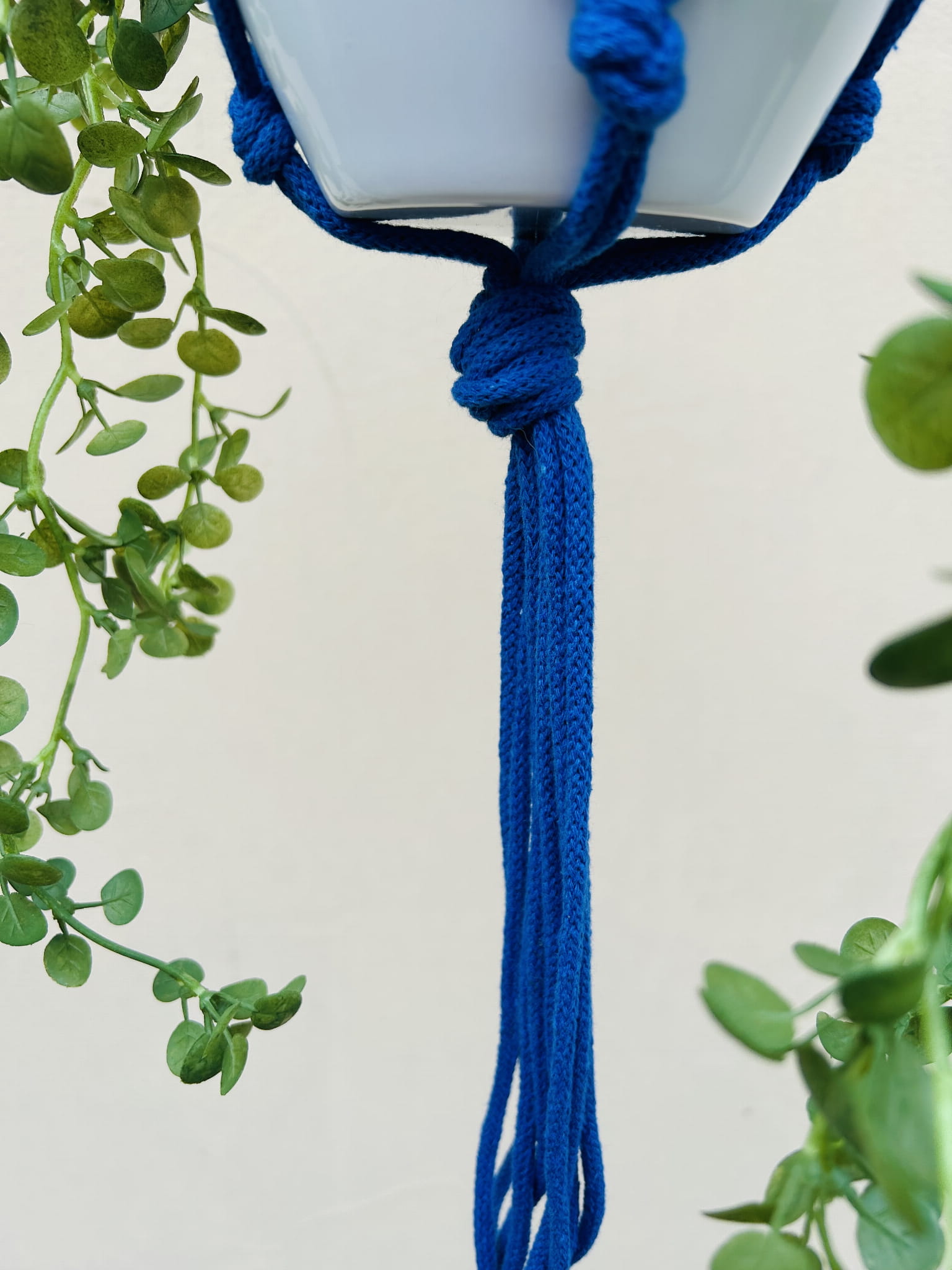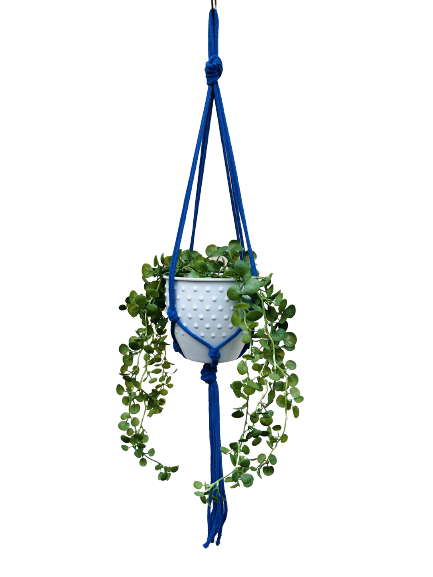 Kwietnik wiszący makrama. Wykonany ręcznie ze sznurka bawełnianego 5mm w kolorze chabrowym.