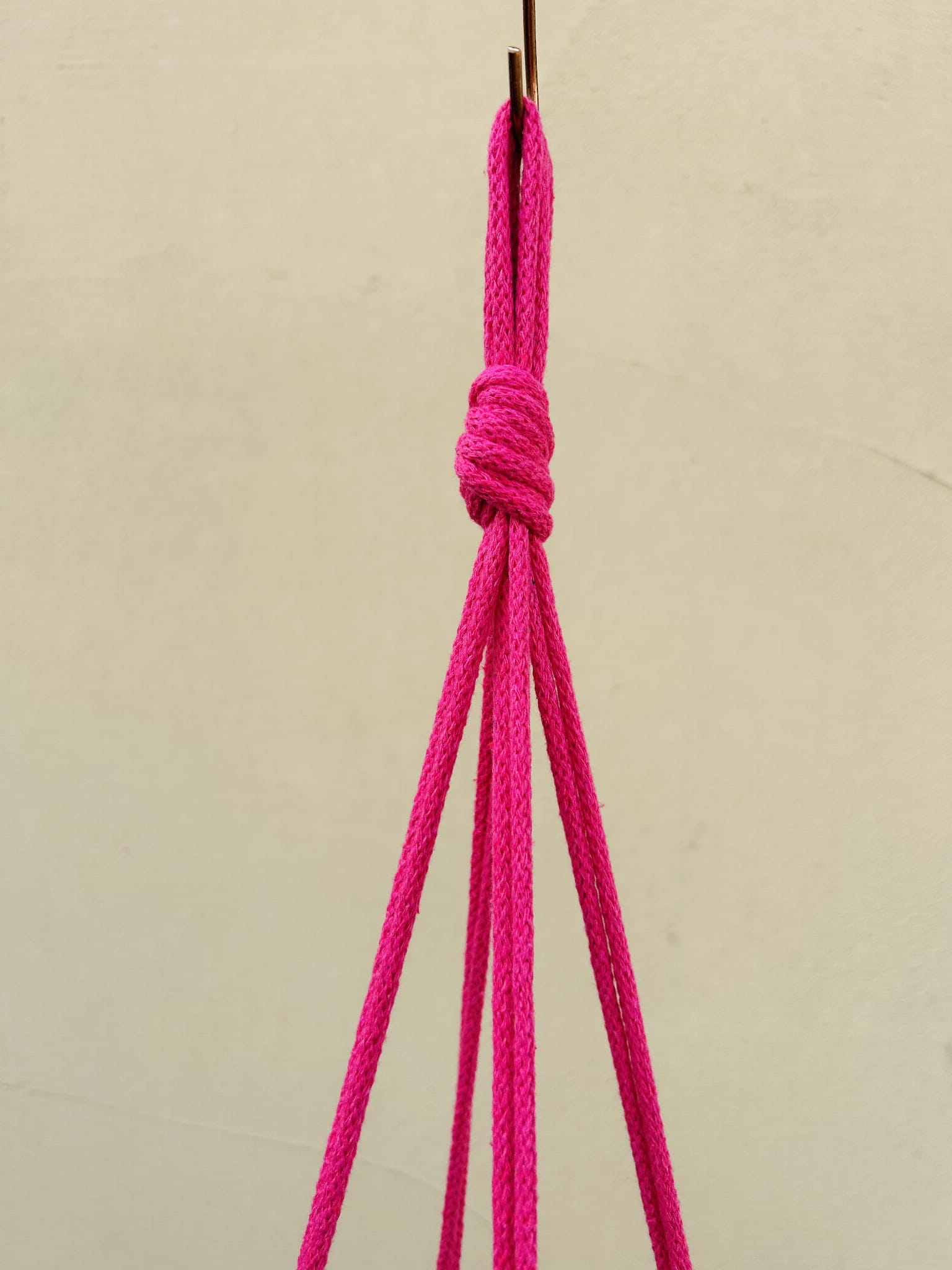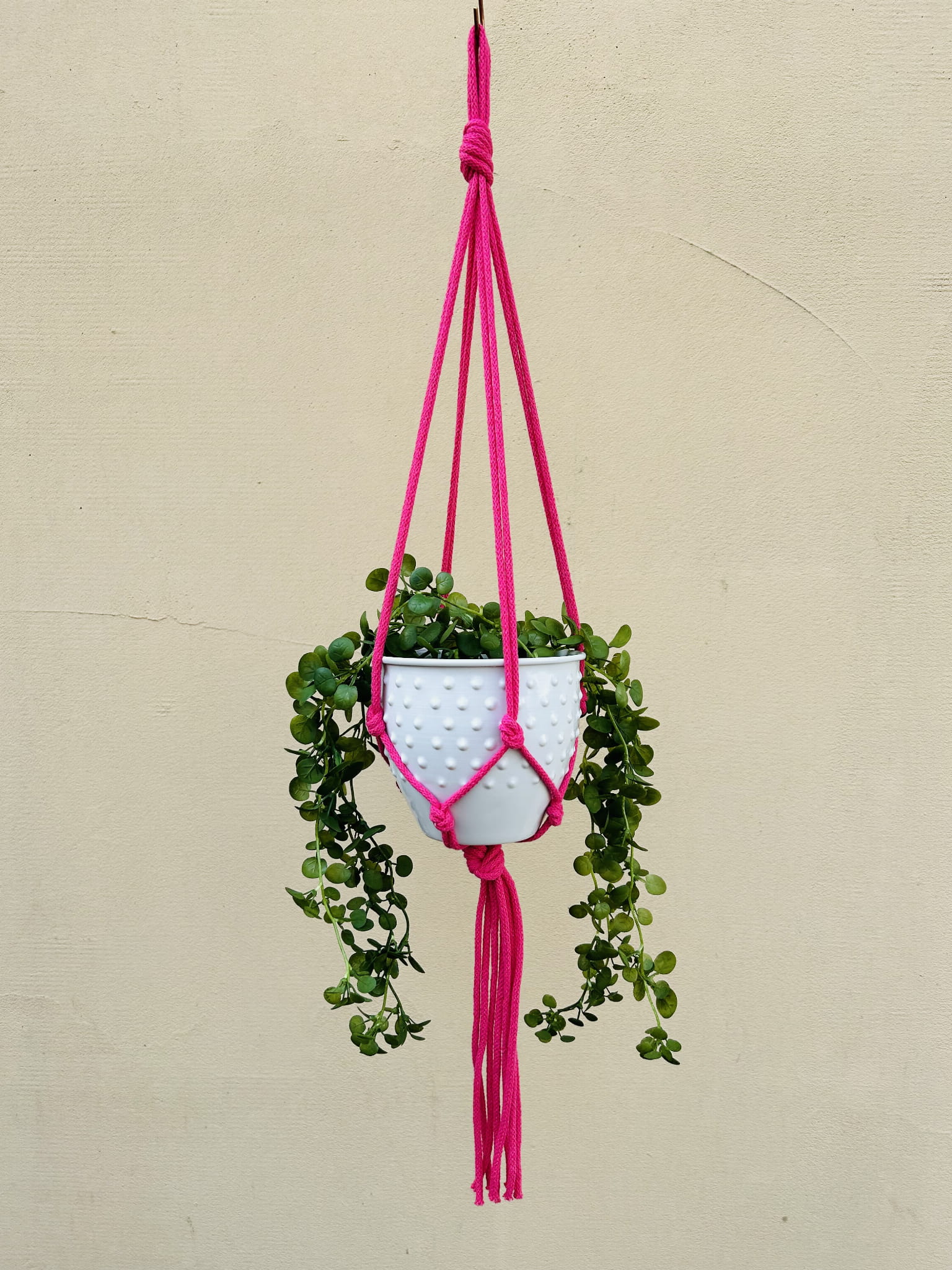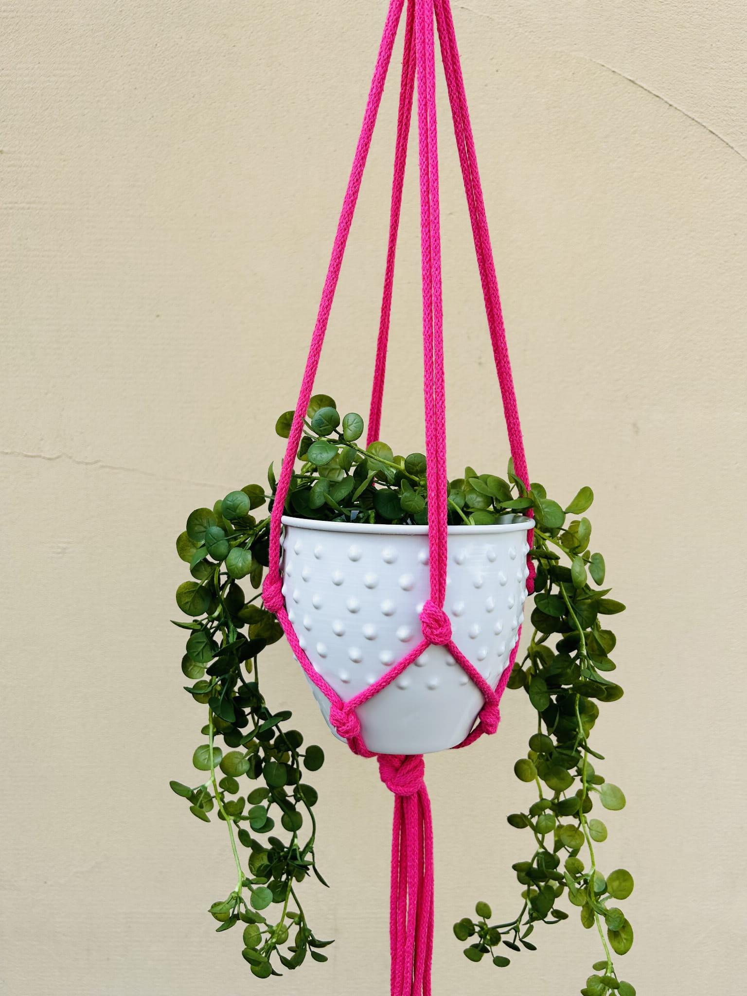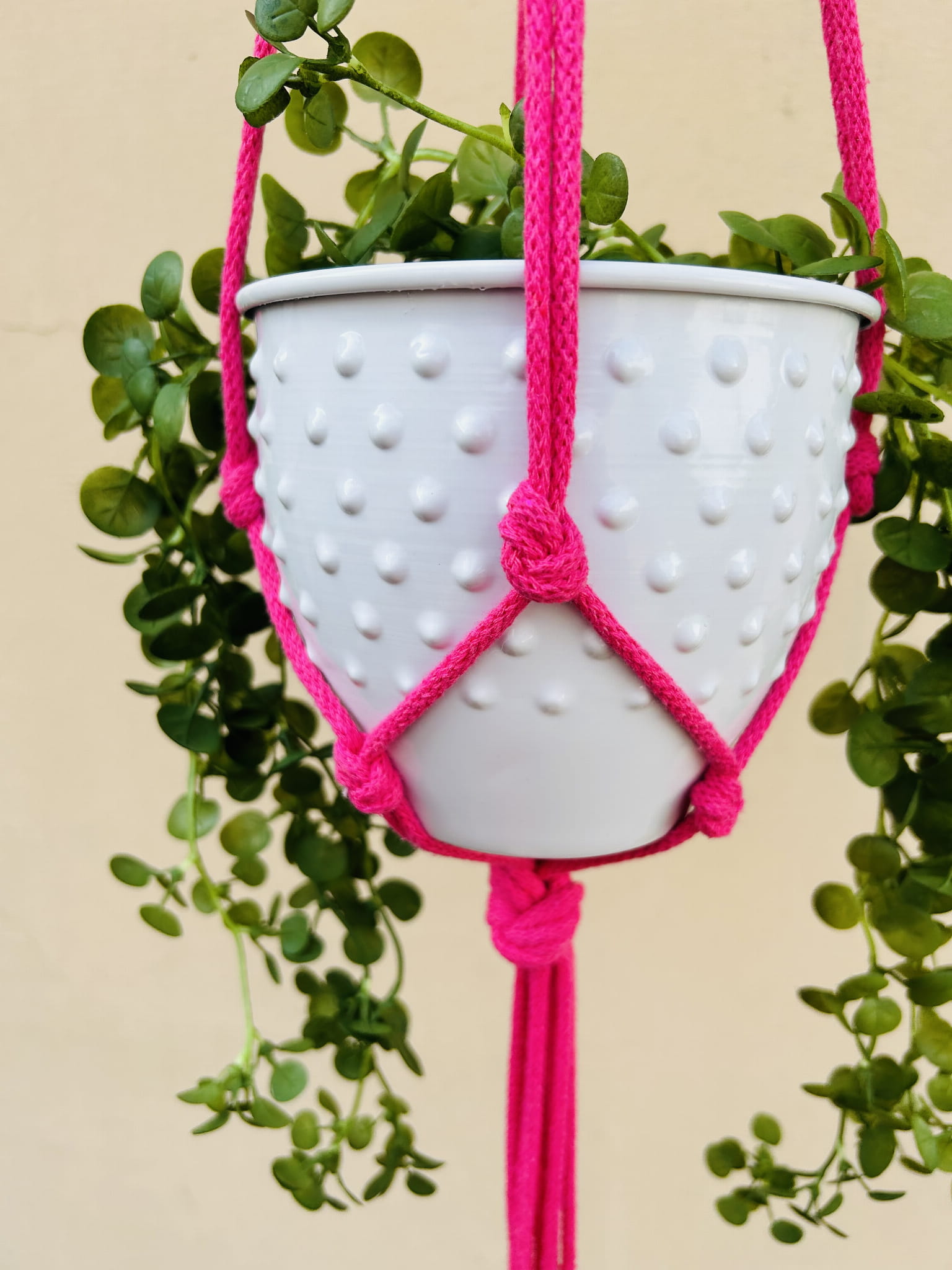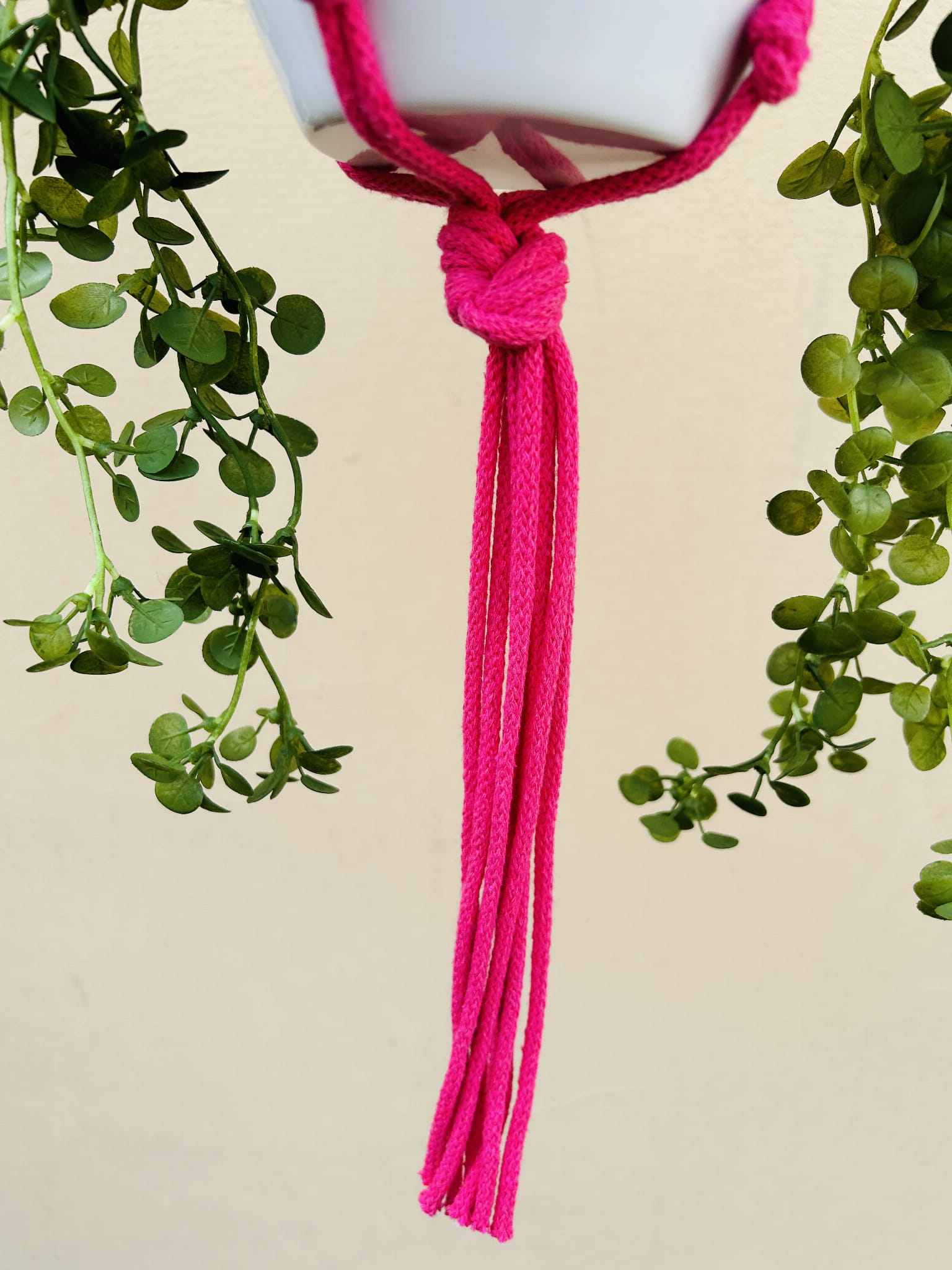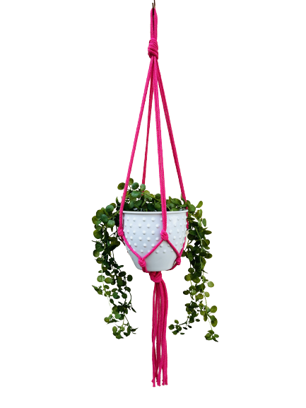 Kwietnik wiszący makrama. Wykonany ręcznie ze sznurka bawełnianego 5mm w kolorze fuksji.