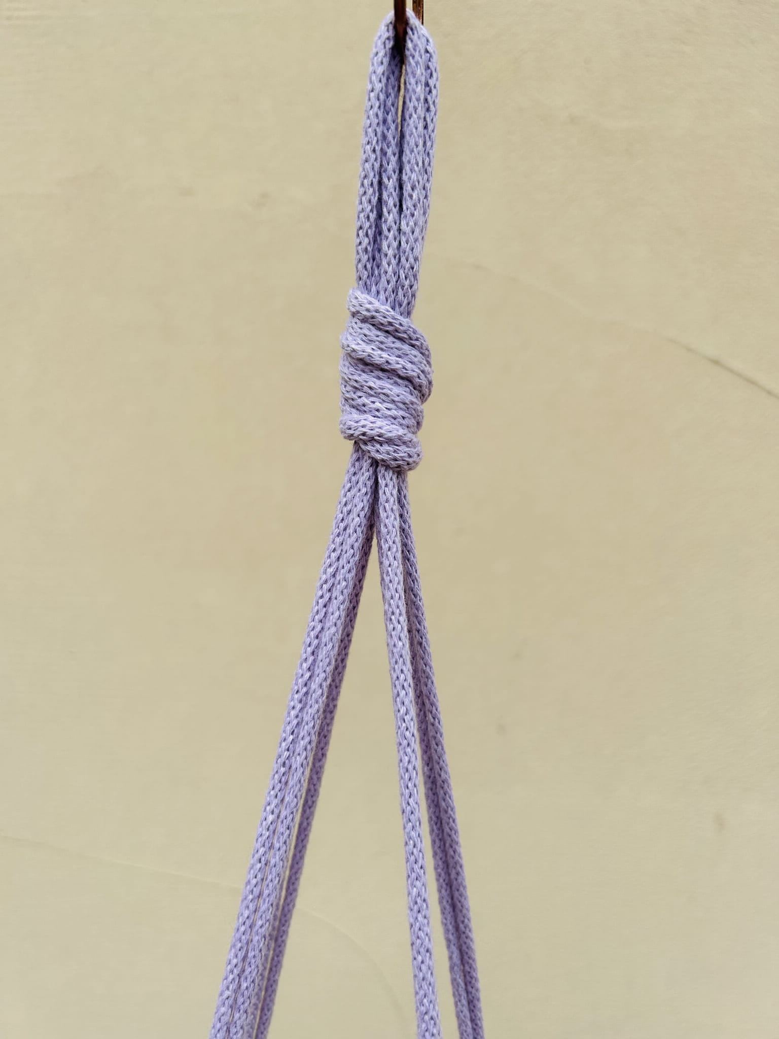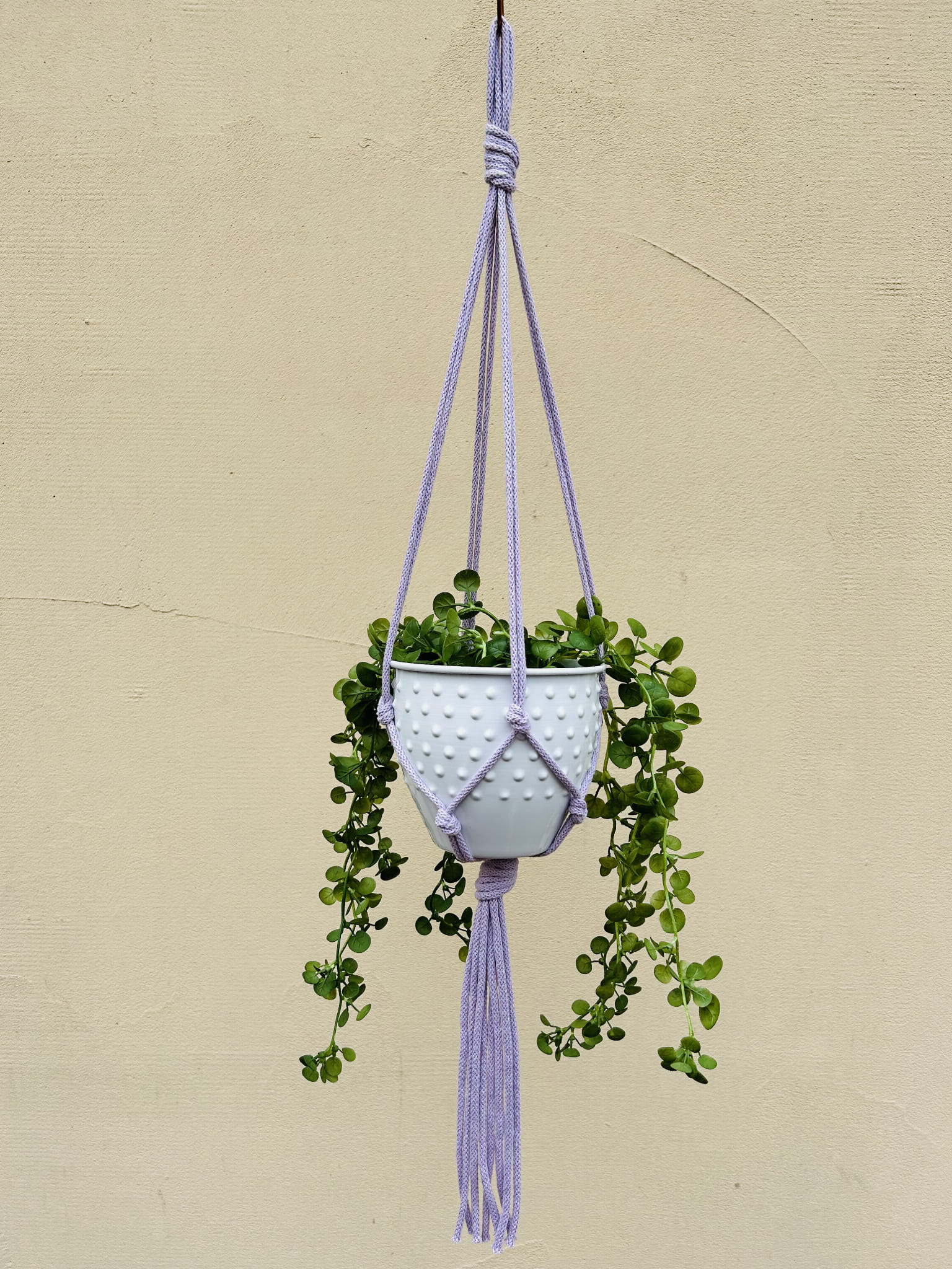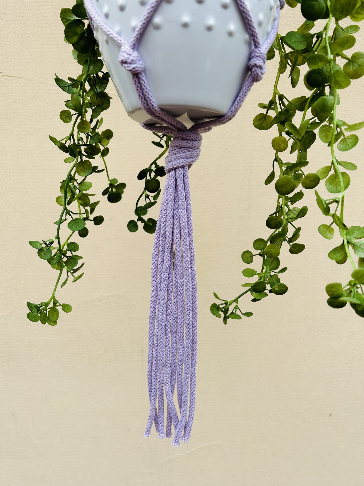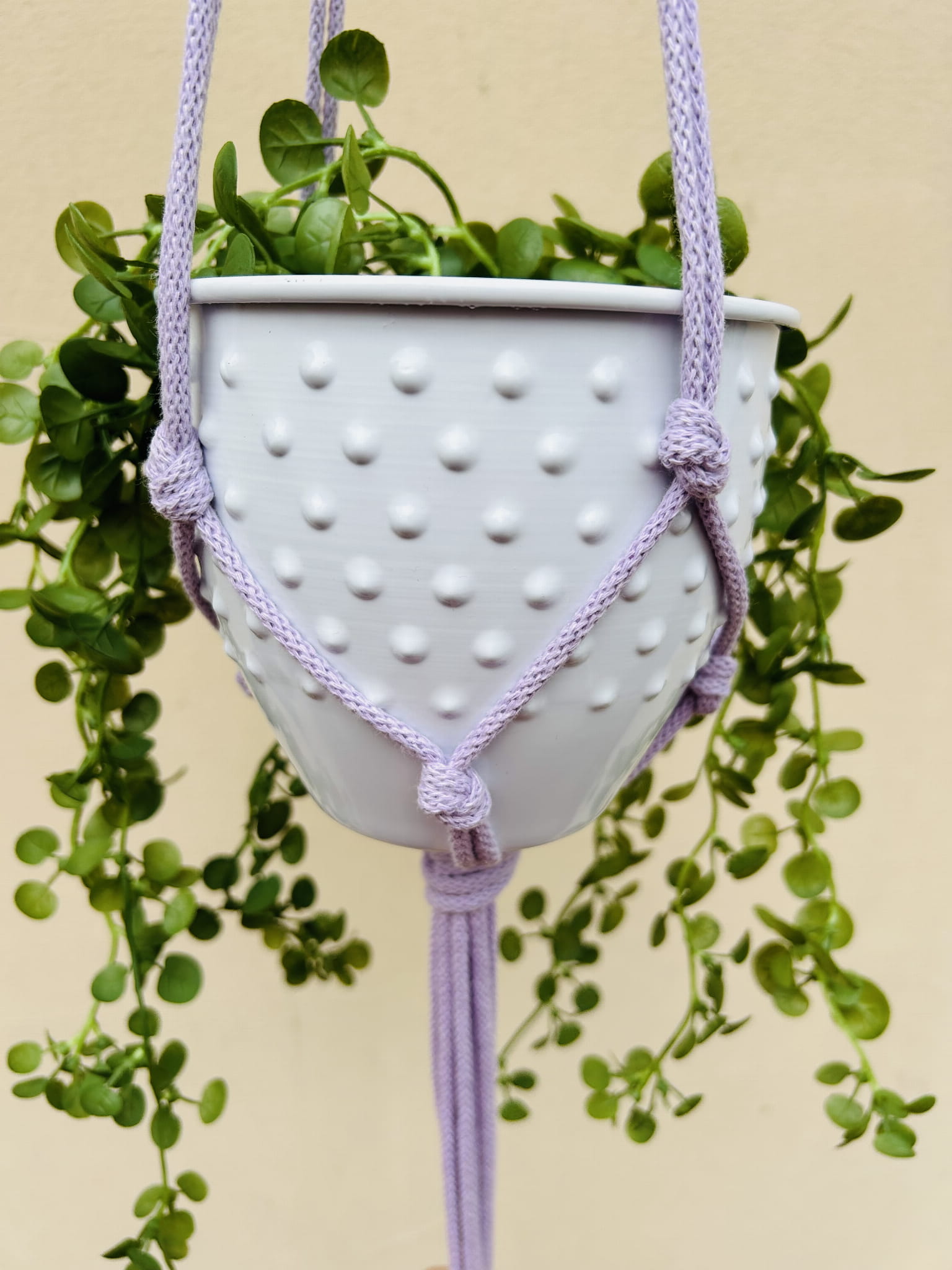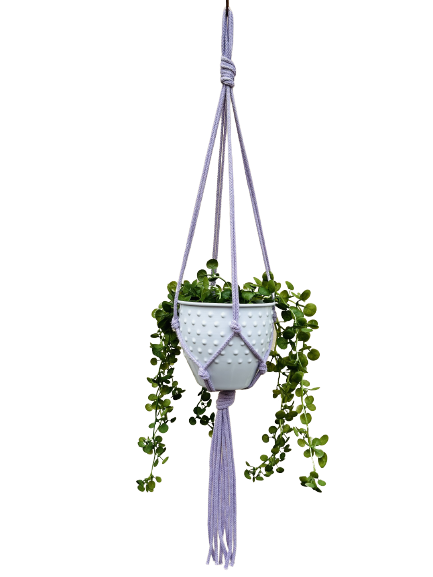 Kwietnik wiszący makrama. Wykonany ręcznie ze sznurka bawełnianego 5mm w kolorze liliowym.