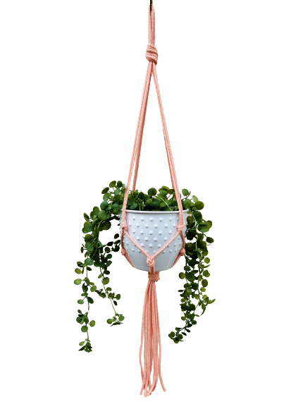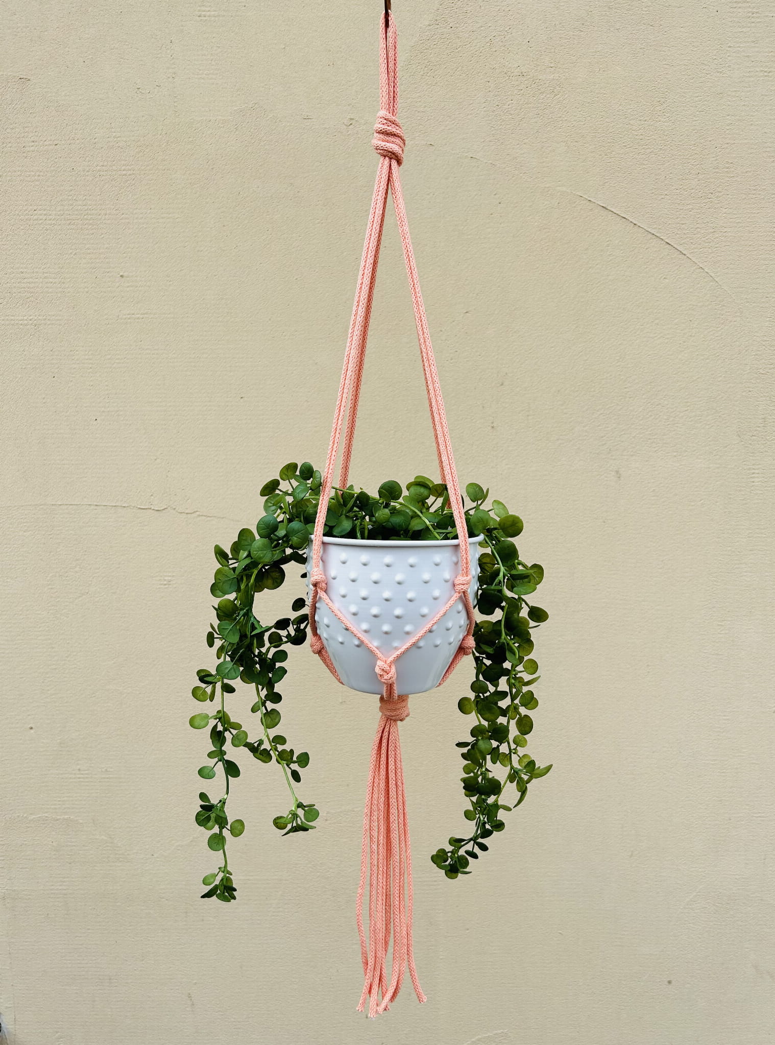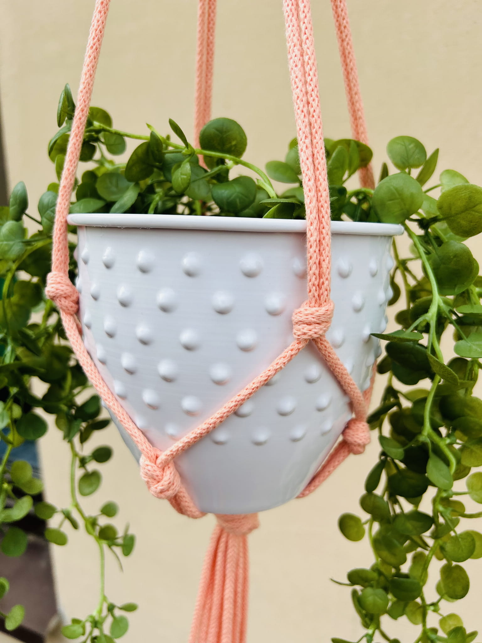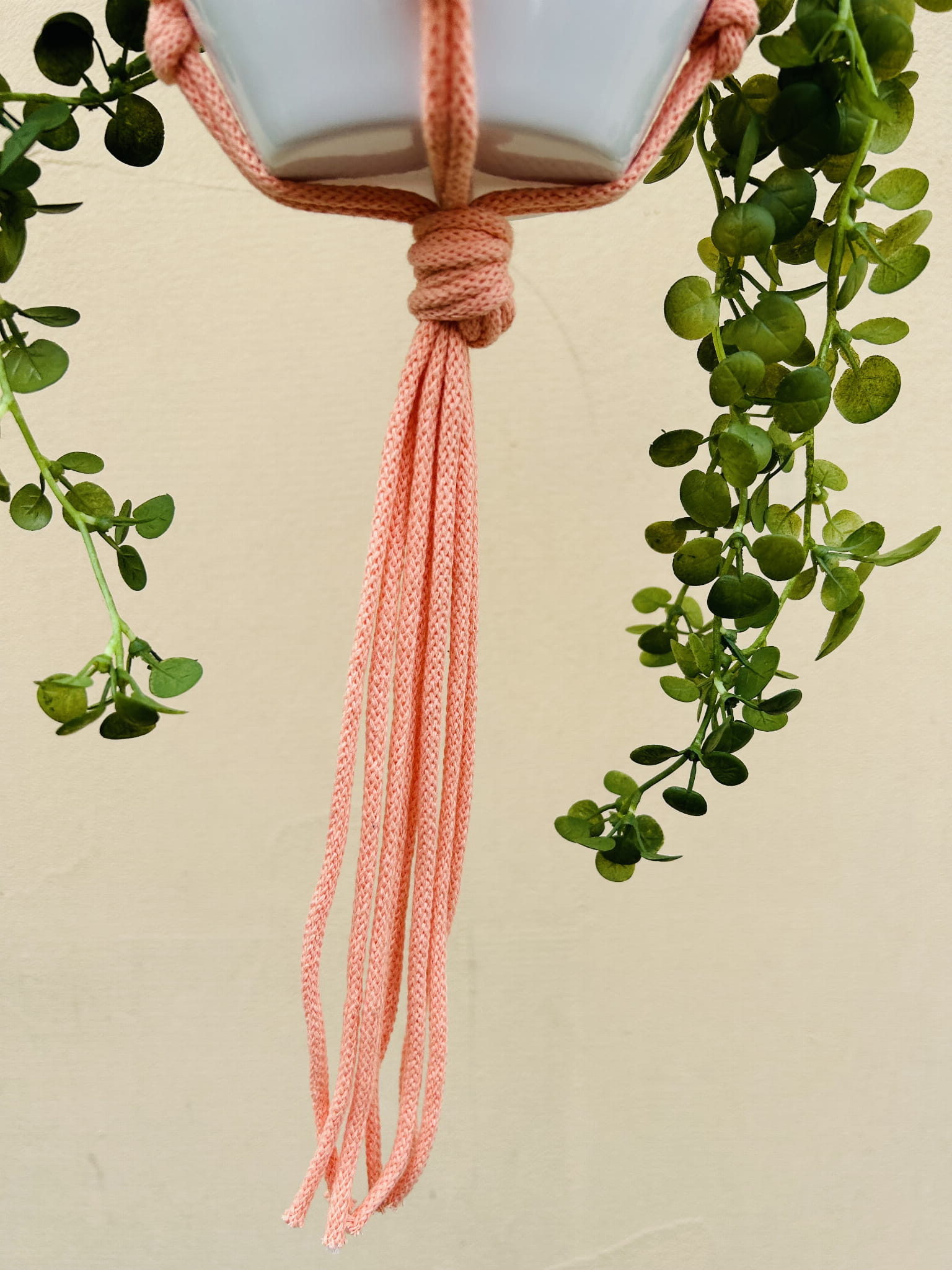 Kwietnik wiszący makrama. Wykonany ręcznie ze sznurka bawełnianego 5mm w kolorze łososiowym.