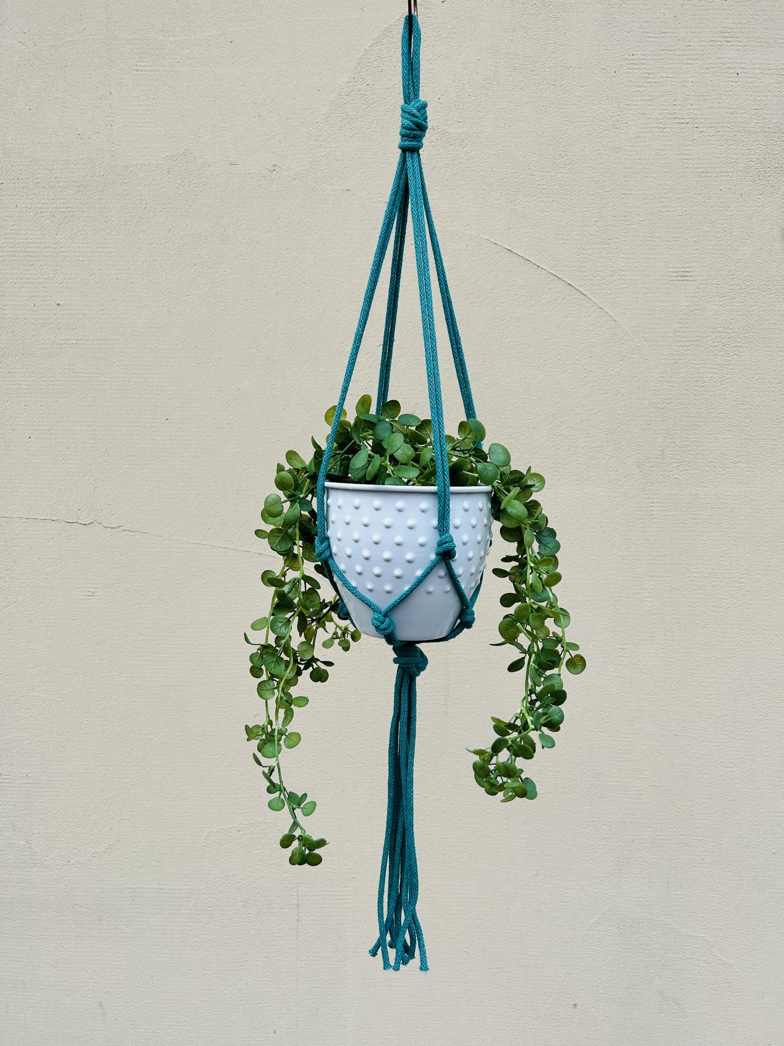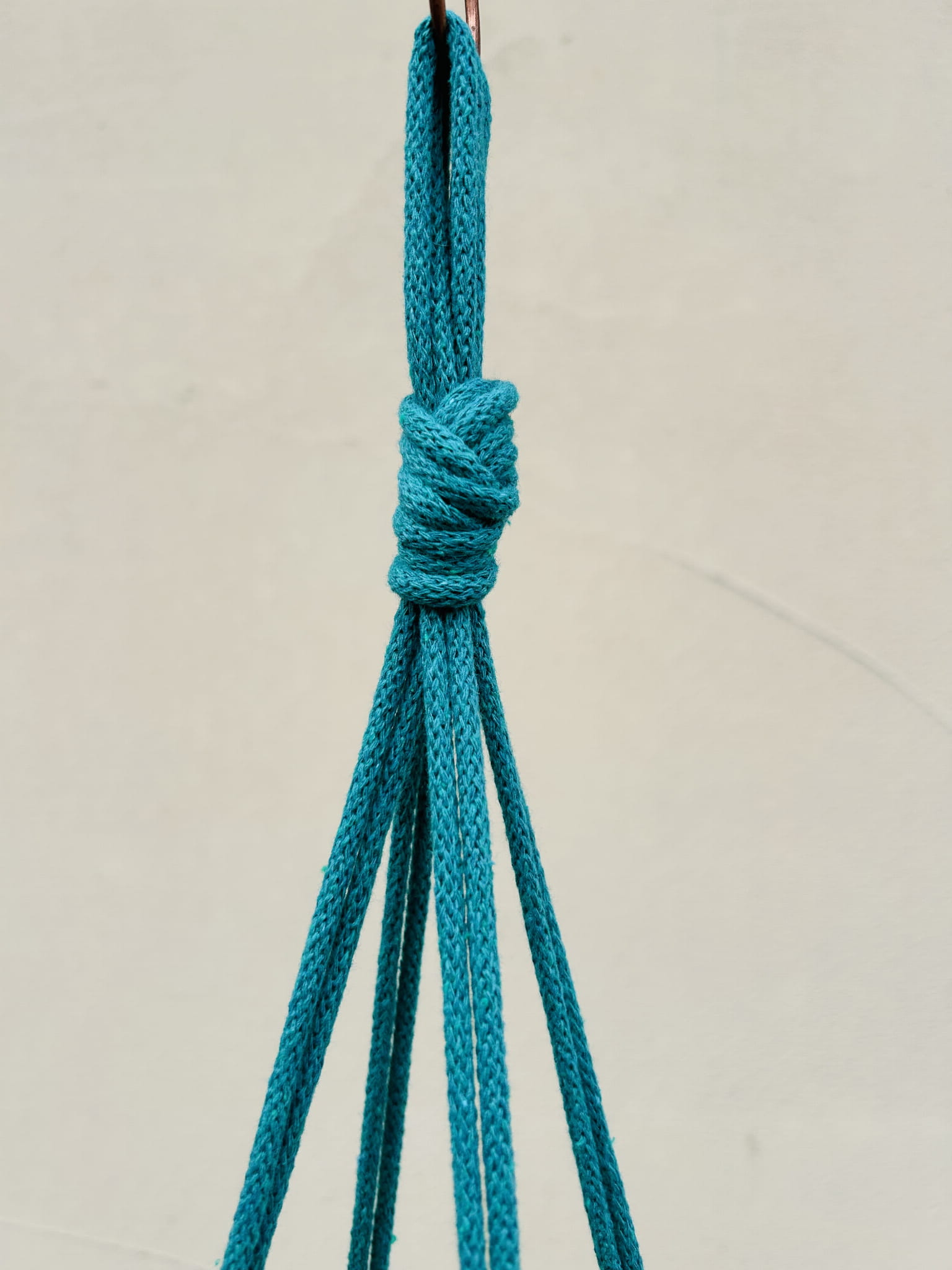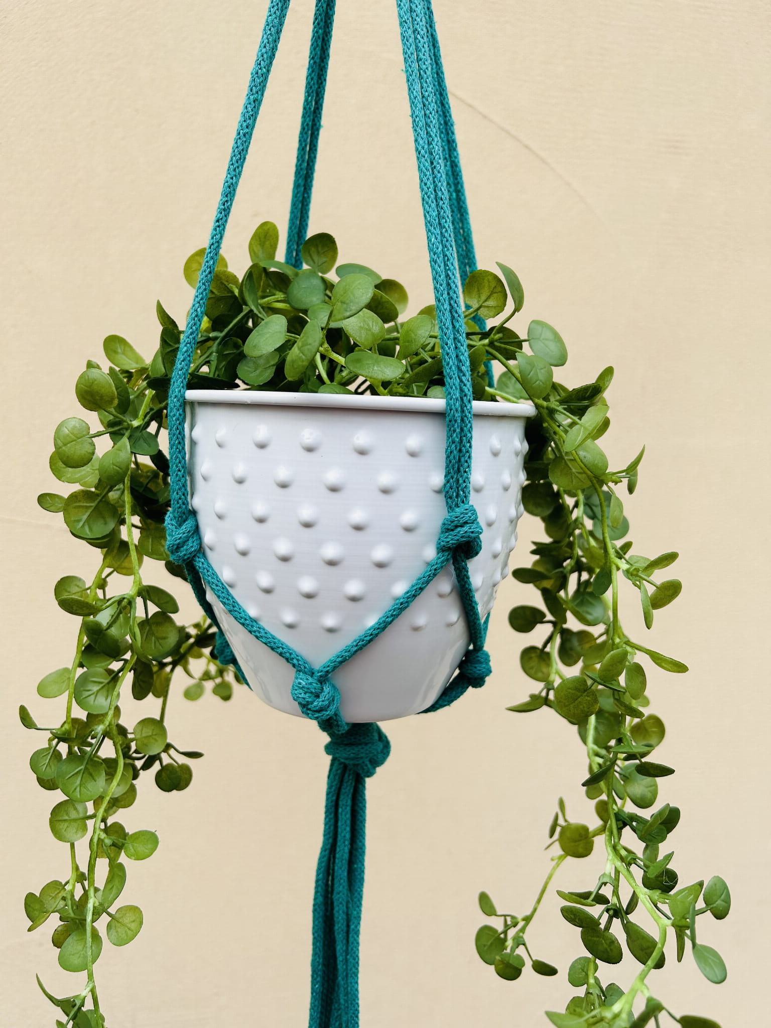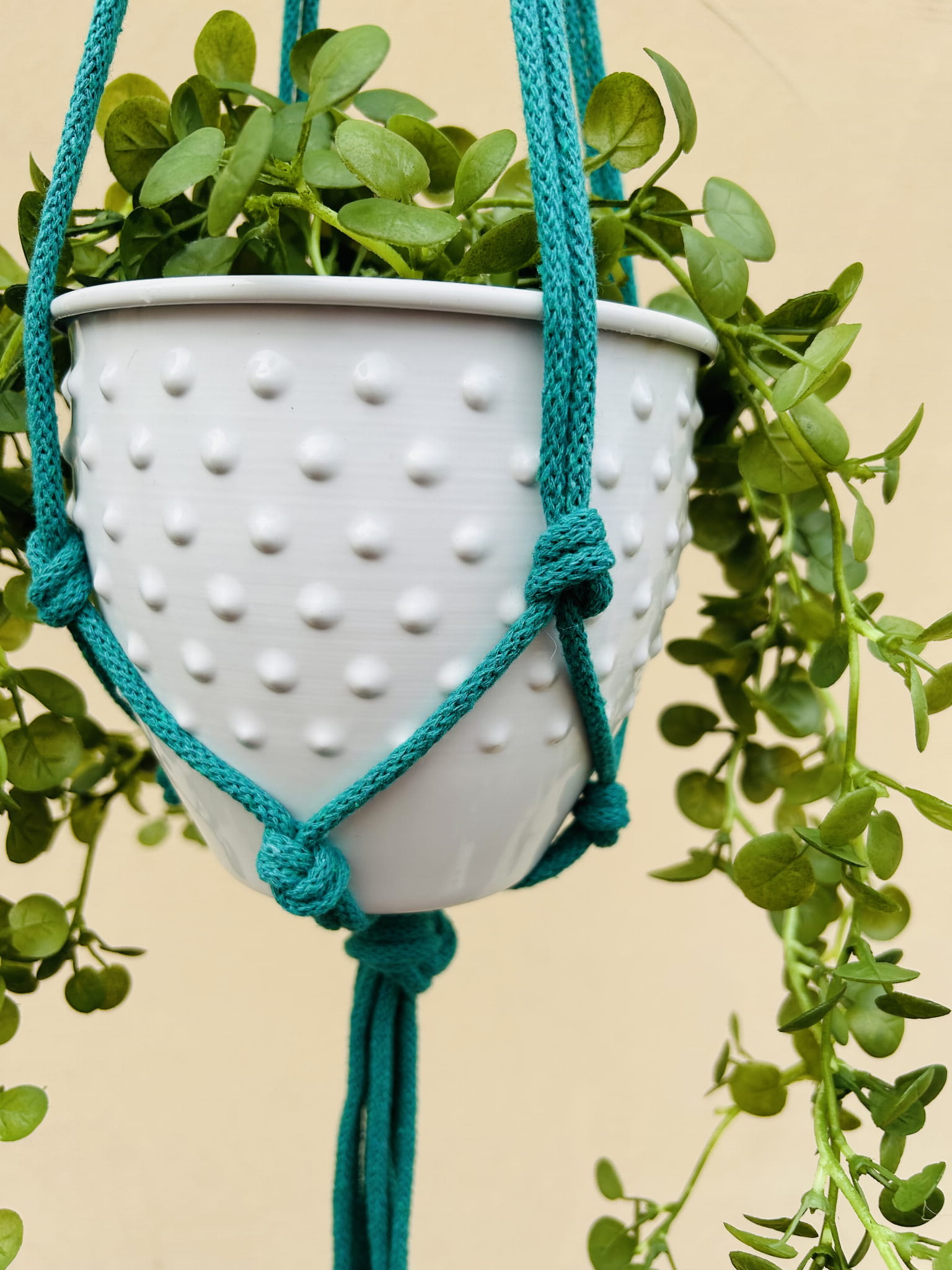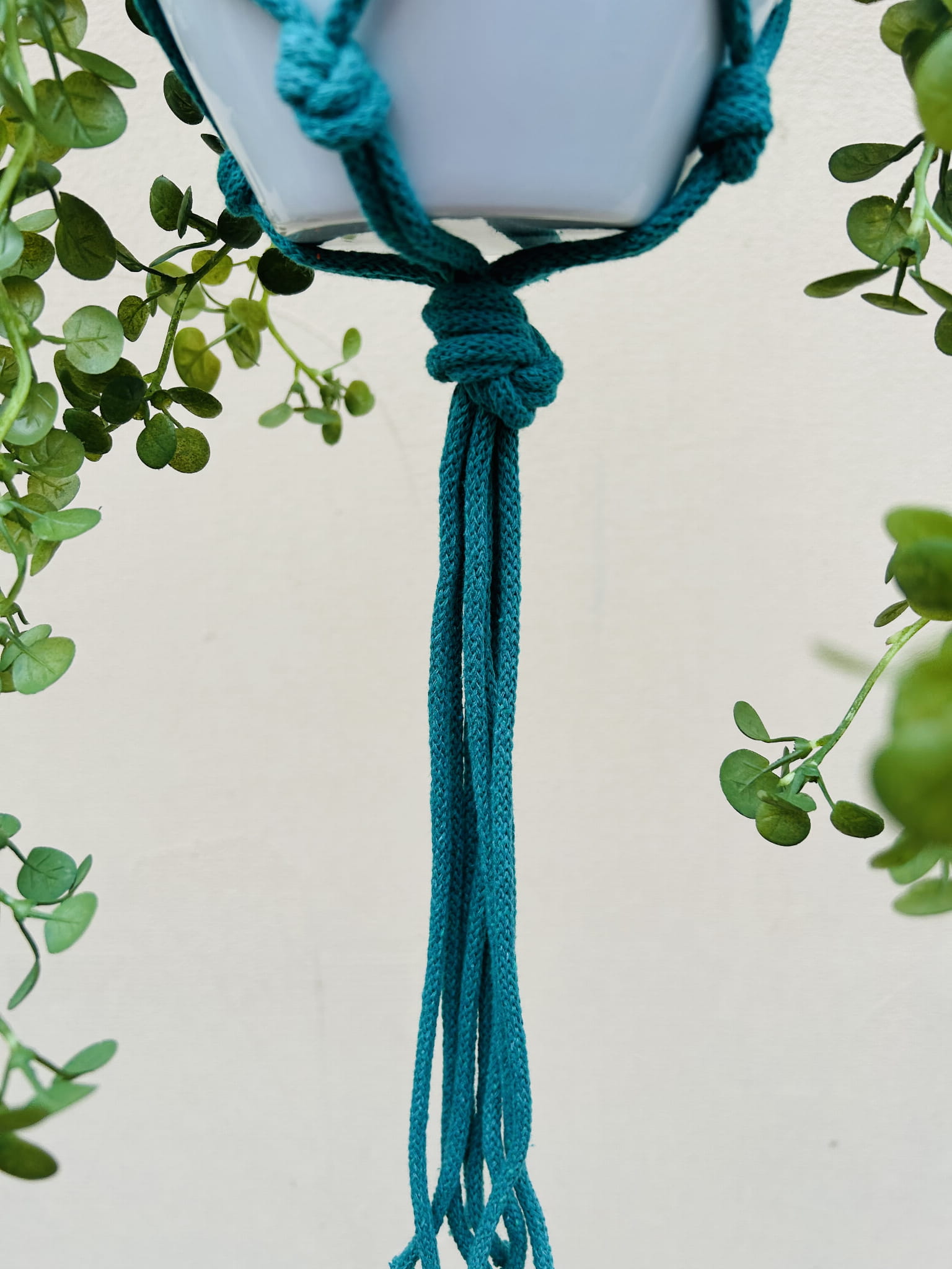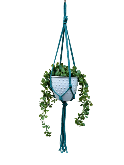 Kwietnik wiszący makrama. Wykonany ręcznie ze sznurka bawełnianego 5mm w kolorze turkusowym.