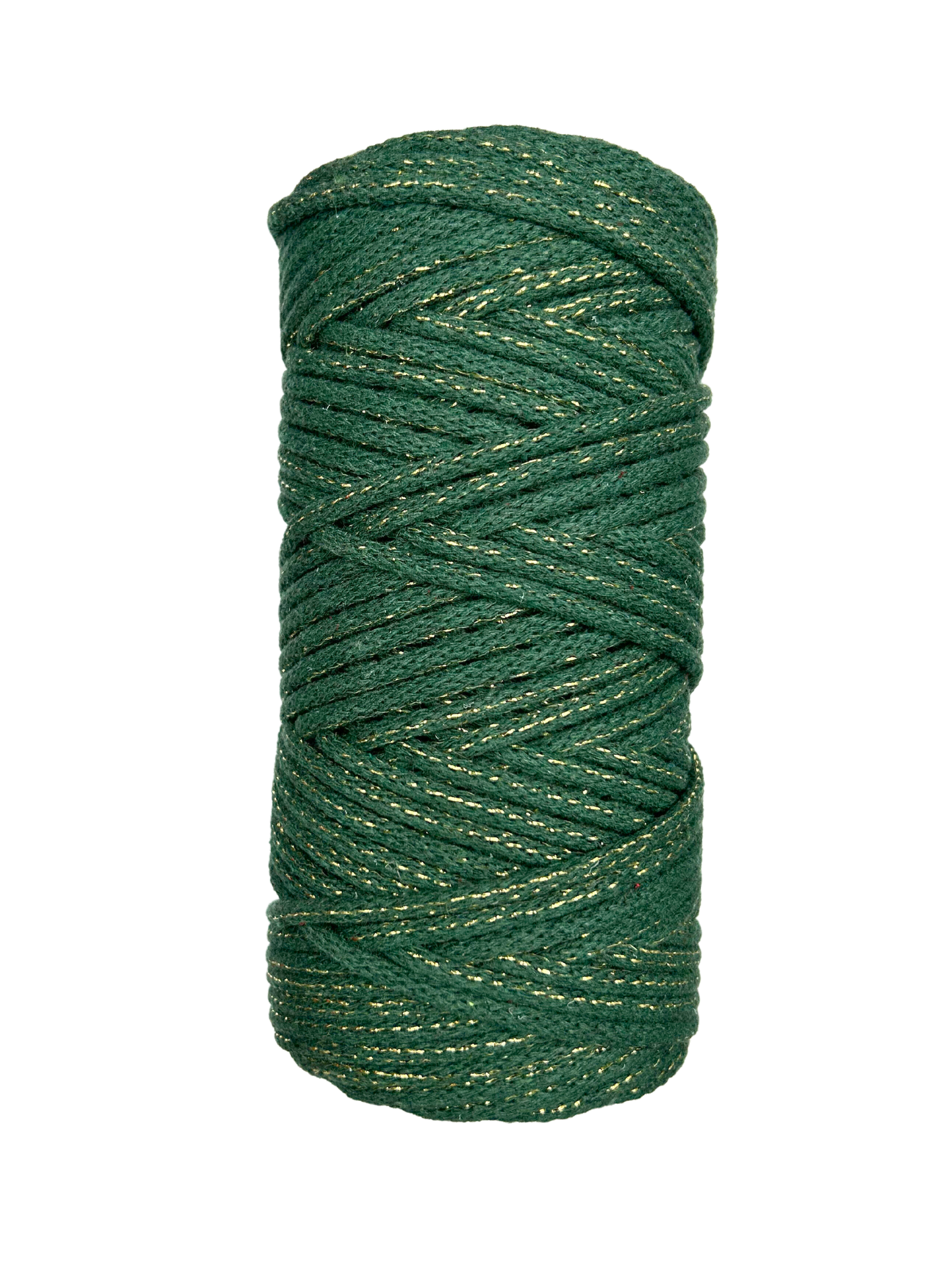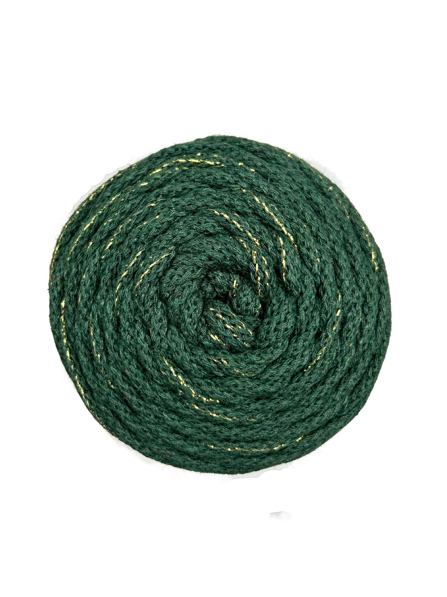 Sznurek bawełniany pleciony w kolorze butelkowej zieleni ze złotą nicią.